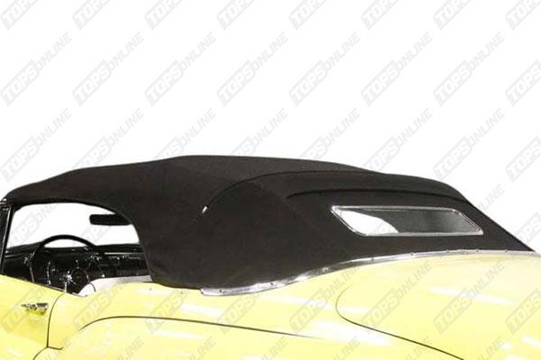 Factory Style Top with Double Thick layer Horse-Shoe style Zipper Rear Window Blank Curtain. New Glass Window not included with the Top, you can RE-Use your own Glass or buy it separately. Included with the Top, Wire-On trim & Chrome ends to hide the Staples above rear window bow & above windshield bow. We offer Haartz Pinpoint Vinyl, Haartz Stayfast Cloth and Haartz Twillfast Cloth materials. Other colors can be ordered, please inquire.