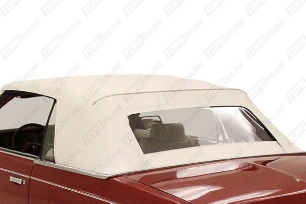 Factory Style 2-piece Convertible Top With Non-Original Zipper Plastic Window. Included with the convertible top: Wire-On trim & Chrome ends to hide the staples above the rear window bow, and matching top material to use for the front header-seal (the front header-seal is not the front Rubber Weather Seal). Original material is the Haartz Pinpoint Textured Vinyl. Other colors can be ordered, please inquire