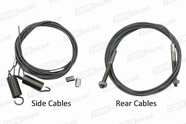 Plastic coated Steel side Tension Cables with Springs, Side Tension Cables are threaded into pocketed hems on the Top that run along the side windows, Rear Cable is threaded into pocketed hem on the Top Quarters, nuts on each end are tightened to hold the top to the body. You can re-use your existing Top Cables if they are in good shape. Side Tension Cables sold as a set, Rear Cable sold as each, buy one order each per car.