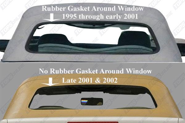 Factory style replacement Top Only. Made as original with plastic extrusions, no deck seams, and no binding. Top fits cars with Rubber Gasket around the rear window as shown in picture. For cars without Rubber Gasket around the rear window, go to 2001 through 2002 model page. Convertible Top fits both Left & Right hand drive models.
