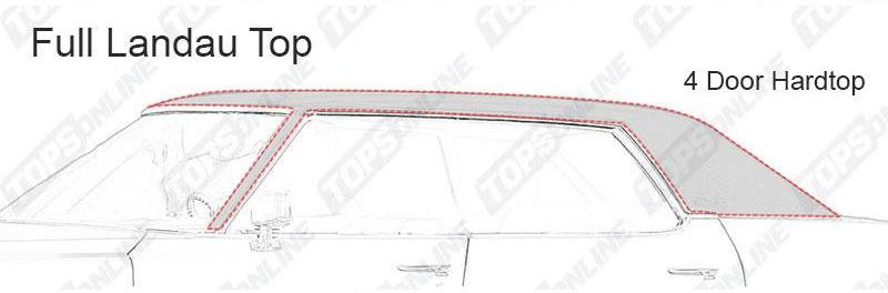 A full Landau top is vinyl material fixed to the exterior metal roof, simulating a convertible-style roof. It covers the entire roof and rear quarter panels, creating a classic, upscale look reminiscent of early town-car designs.